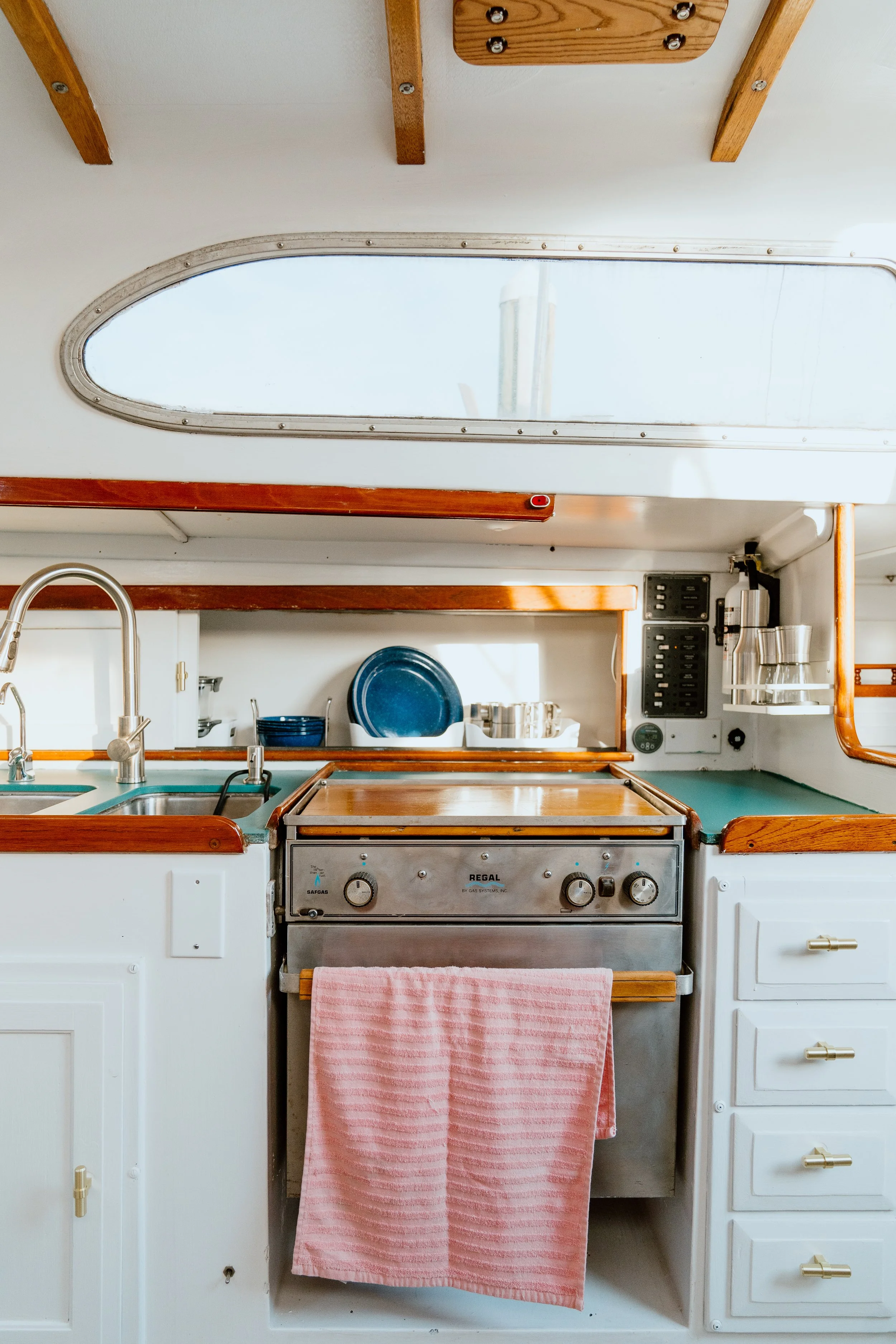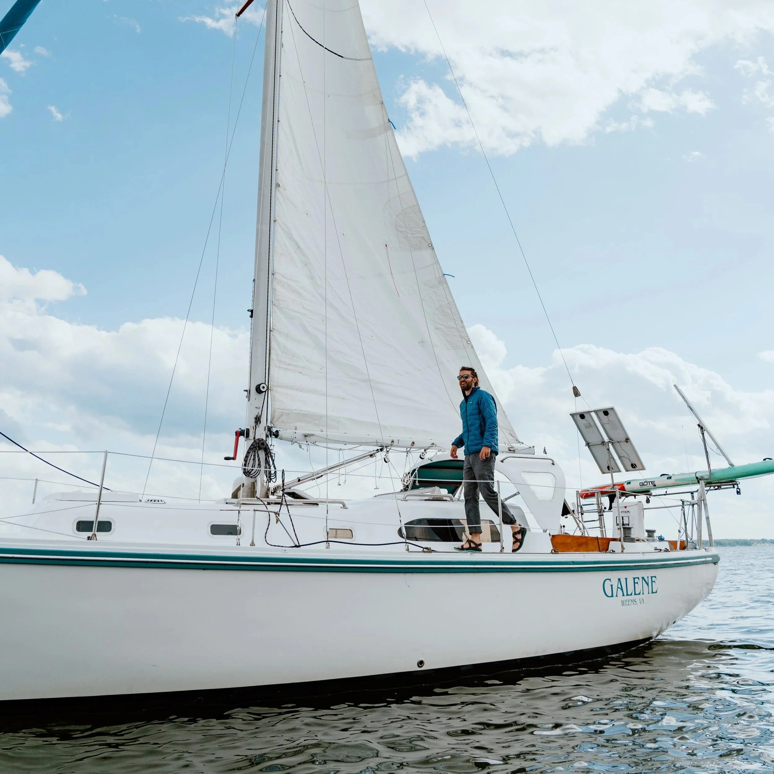 Galene is a 36’ monohull designed for small groups of up to four guests, offering a comfortable, uncrowded way to experience sailing on the Chesapeake. She has ample cockpit seating for relaxing under sail and cushions on the bow if you want to stretch out closer to the action. Inside, the cabin is warm and inviting with a practical layout, making Galene a great choice for an easygoing day on the water.