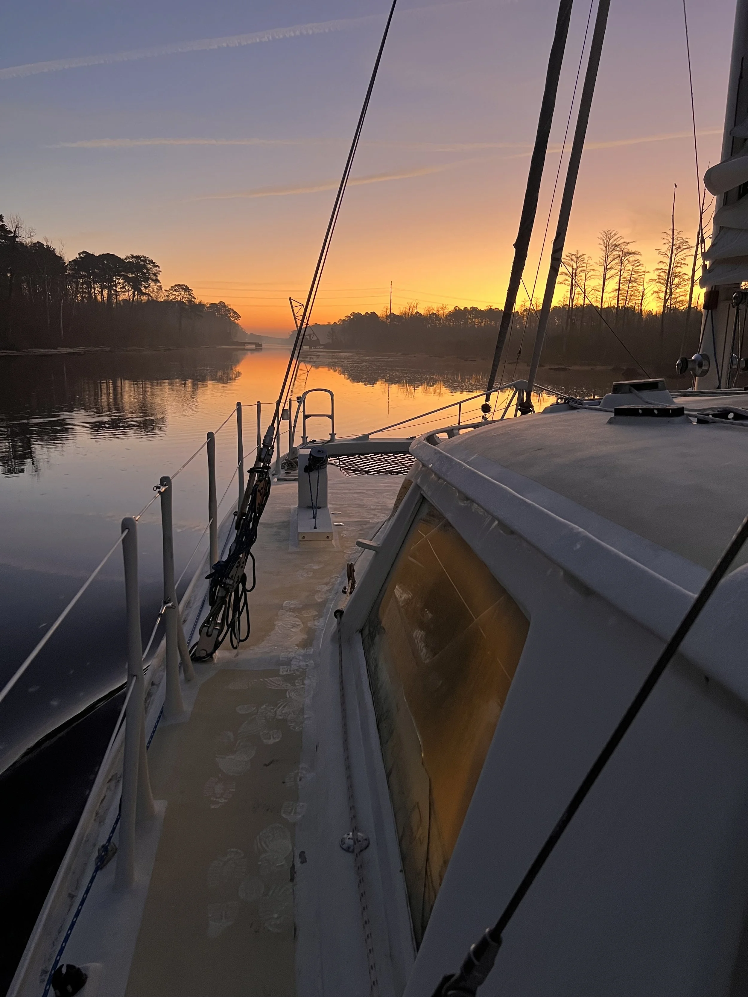 0630 Leave free dock at Great Bridge in Chesapeake, Va with frost on the decks. Plan is to leave early so we can get a full day of travel in.